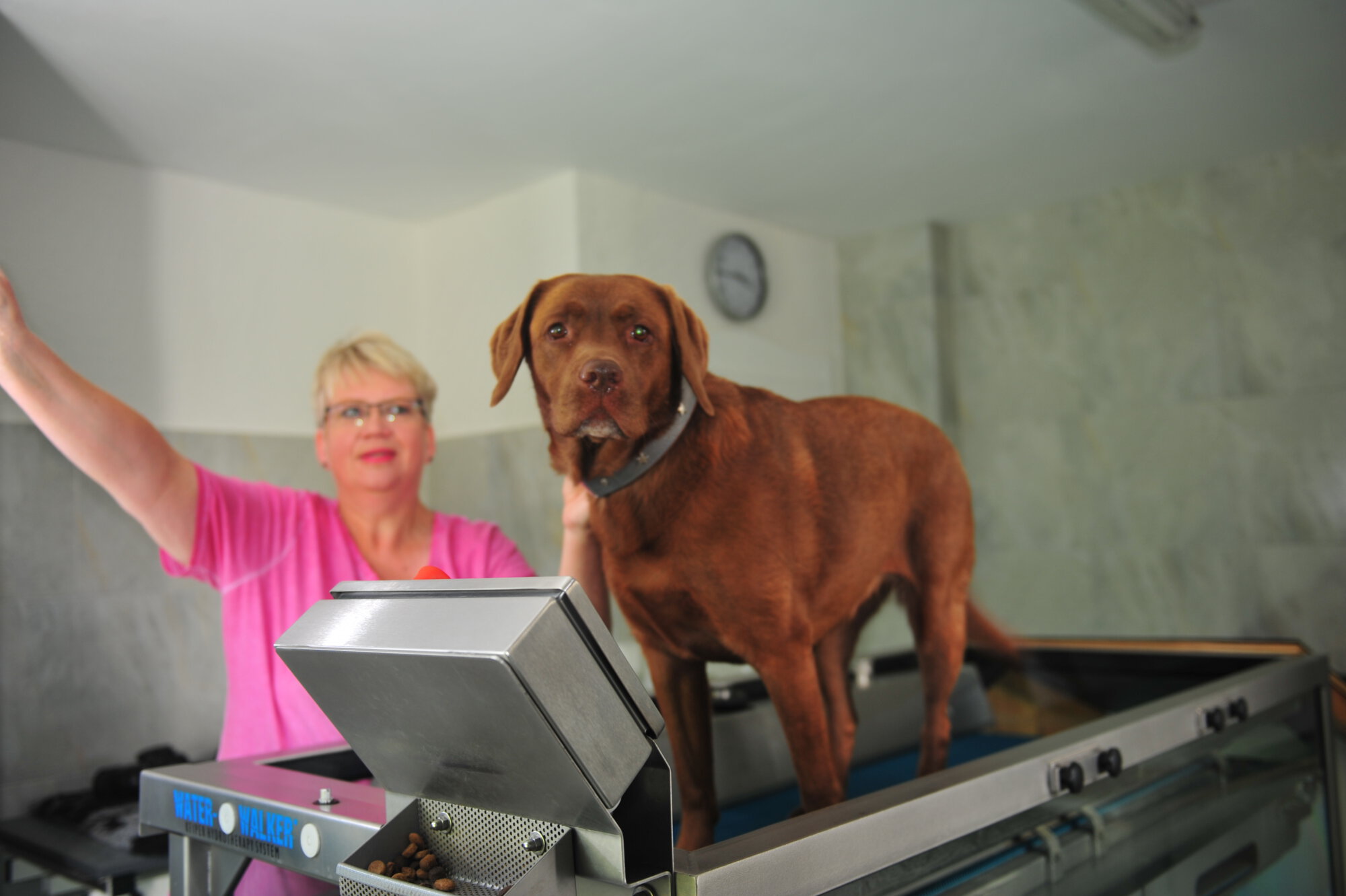 Ich benutze in meiner Praxis für Tierphysiotherapie das Unterwasserlaufband „Water Walker“ der Firma Keiper, in das die Hunde über eine Rampe bequem laufen können. Als Vorbereitung und zur Kreislaufanregung werden die Füße des Hundes zunächst in einer ebenerdigen Duschwanne gesäubert. Der Hund wir innerhalb des Beckens langsam nach unten in das 28 °C warme Wasser abgesenkt, sodass sich das Tier an das Wasser gewöhnen kann.